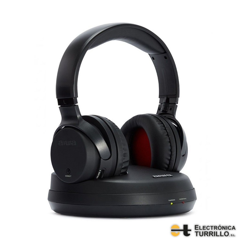 Sistema de auriculares inalámbricos de RF para TV con transmisor en base de carga.