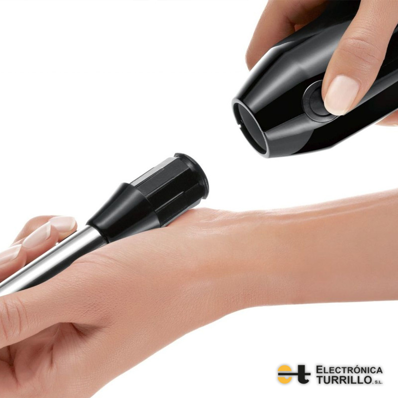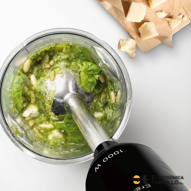 Batidora de mano de alto rendimiento con un potente motor de 1000 W. Tritura, bate y hace puré con enorme rapidez y eficacia.