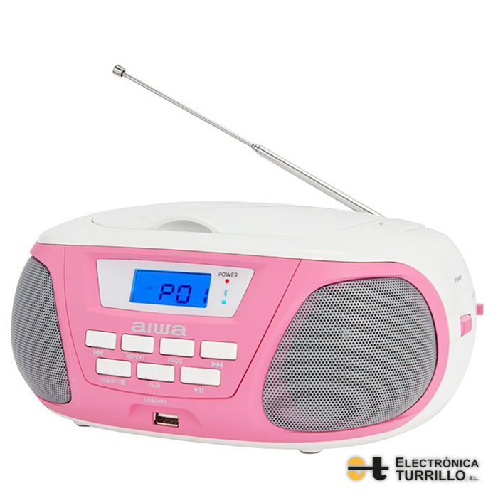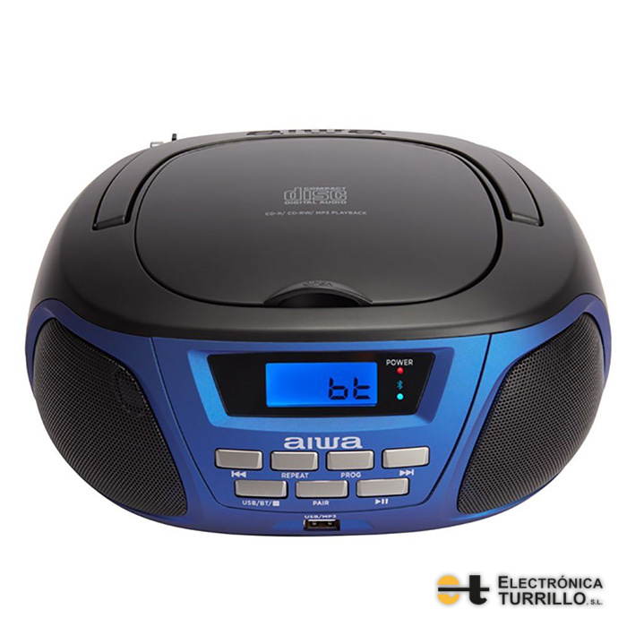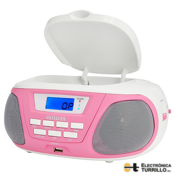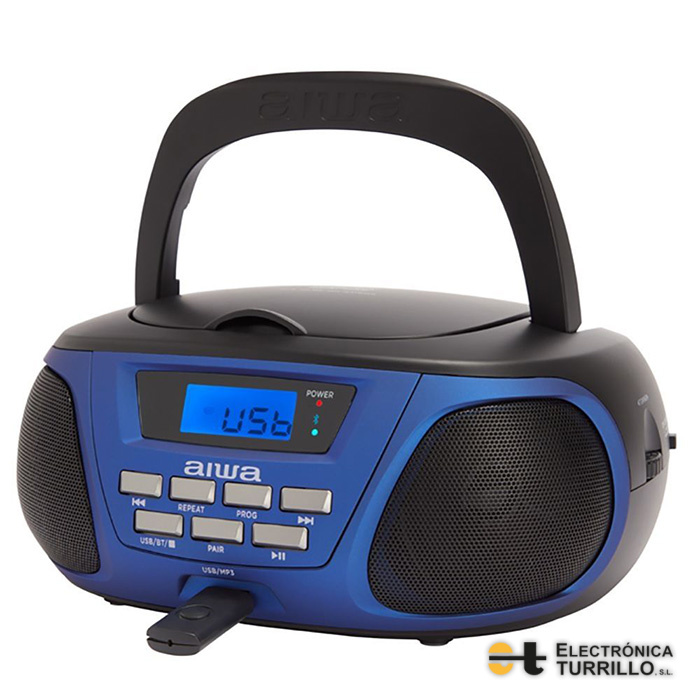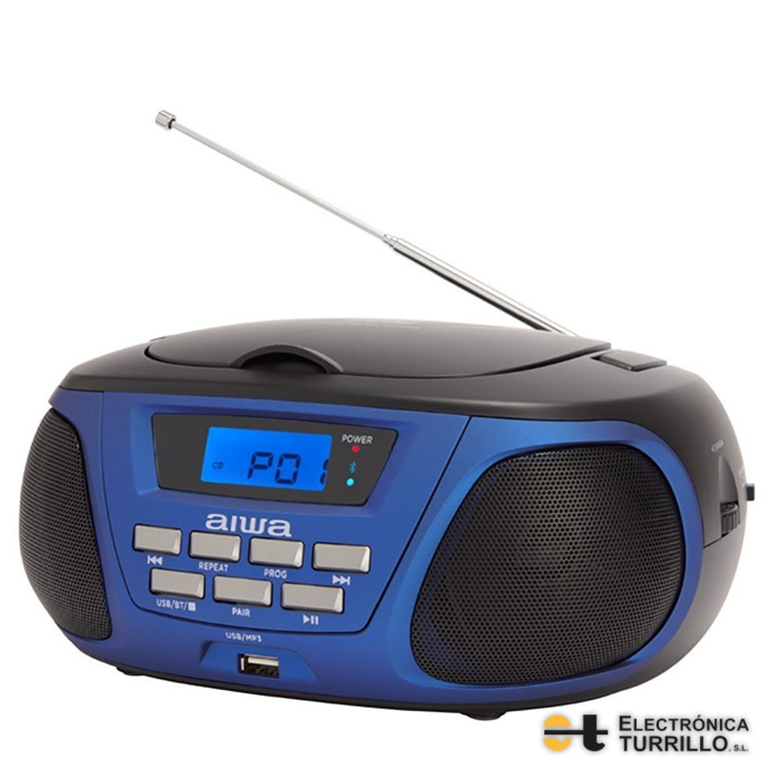 Boombox Aiwa BBTU-300BL Con reproductor de CD, Bluetooth y USB, AM / FM, Pantalla LCD, entradas para auriculares y Aux-in, azul y rosa.