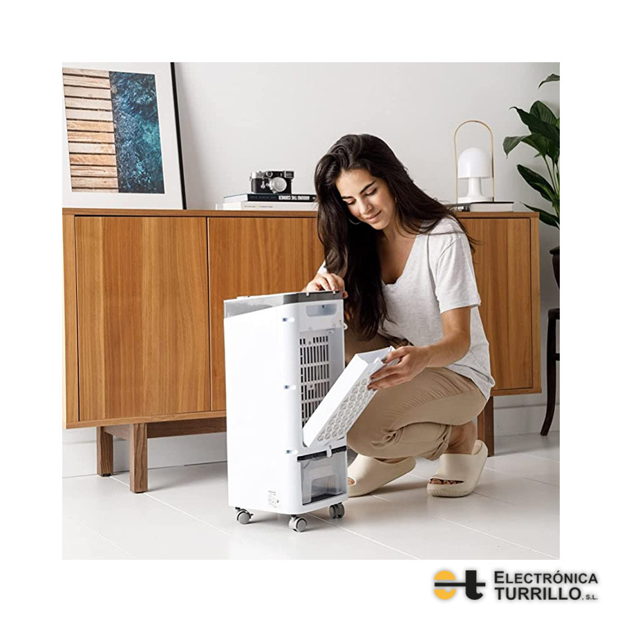 El ventilador con agua cuenta con 4 ruedas y una asa para facilitar el transporte entre estancias. Además, es silencioso, proporcionando un nivel de sonido máximo de 65dB.