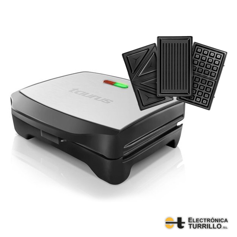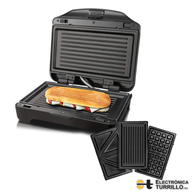 - Incluye 3 placas antiadherentes: sándwich, grill y gofre